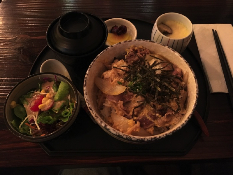 サラダに滑蛋牛肉丼(≒卵とじ牛丼)・お味噌汁・漬物・茶碗蒸しがセットの内容です。